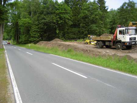 | Juni 2006: Da kein tragfähiger Untergrund vorhanden war, muß das Planum für die Fahr-zeughalle komplett neu errichtet werden. Die Halle wird an dieser Stelle ca. 3,5 m über dem Straßenniveau liegen. | ||
