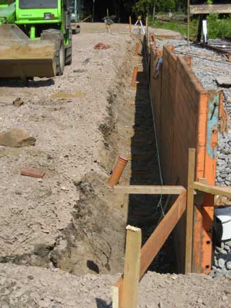 | 7. Juli 2006: Die Rigole ist fertiggestellt. Spundwände halten den Schotter zurück, bis die Bodenplatte gegeossen ist. | ||