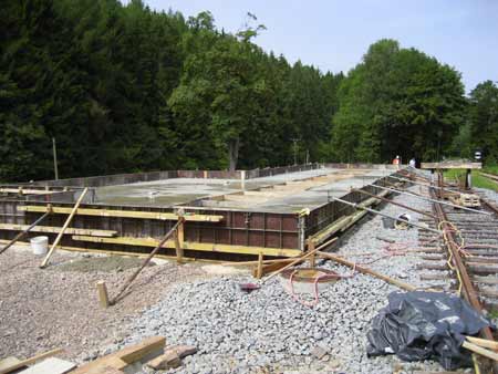 | 28. Juli 2006: Die Bodenplatte ist fertig gegossen und härtet noch aus. Die "Rinne" in der Mitte wird das Hallengleis aufnehmen, so daß dieses eben mit der Bodenplatte abschließt. | ||