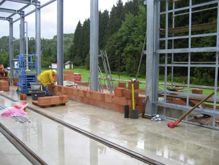 | 4. September 2006: Das Stahlkonstruktion und die Dacheinschalung sind fertiggestellt. Die Aufmauerung des Nebengebäudes geht zügig voran. | ||