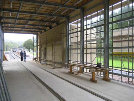 | 8. September 2006: Blick vom Streckengleis auf die neue Halle. Hier wird gerade die Unterkonstruktion für die Lärchenholzverkleidung angebracht. | ||